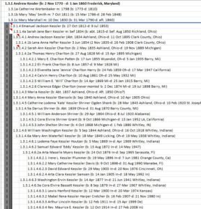 But there are some contradictions that create doubt about whether this is actually Andrew’s son: 1) My records indicated that Emanuel was born about 1809, but the Census record indicates that he was born about 1812 or 1813; 2) the “Ohio” Emanuel died in 1853, but 3) Andrew Kessler left $2,000 to his son Emanuel in 1860, which does not make sense. Perhaps his will was prepared before Emanuel passed and was never updated.